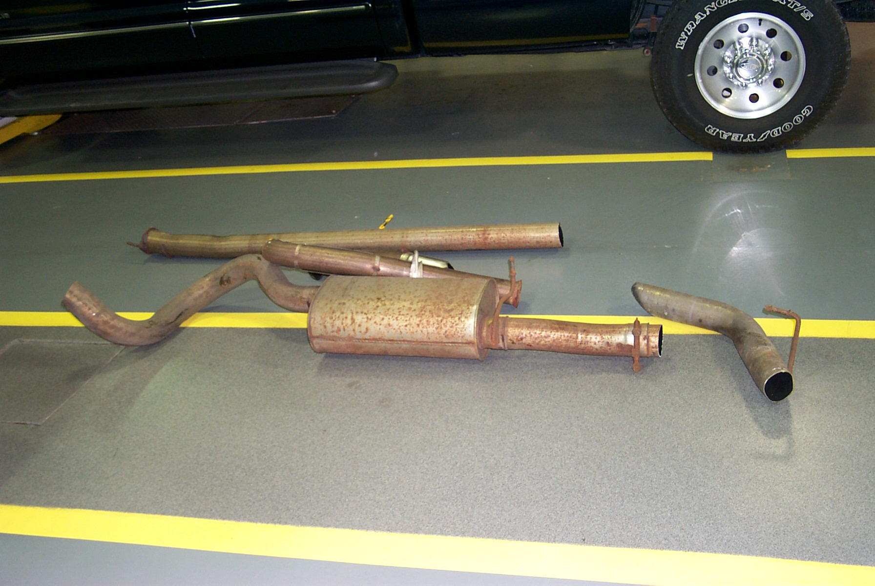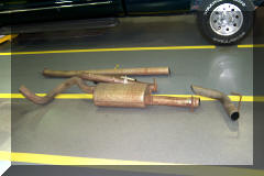 Here's the original - cut at the bend in the down pipe and the intermediate pipe (they would not separate).  Even though the OEM Exhaust may look bad, it should remain solid and last at least 5 Years/100,000 Miles.  I used soapy water to help remove the original exhaust hangers from the rubber pucks.