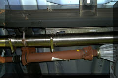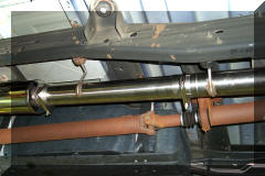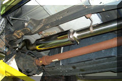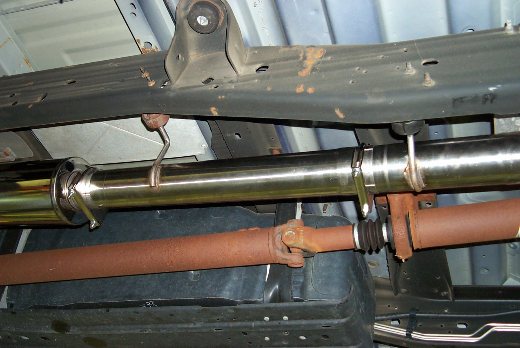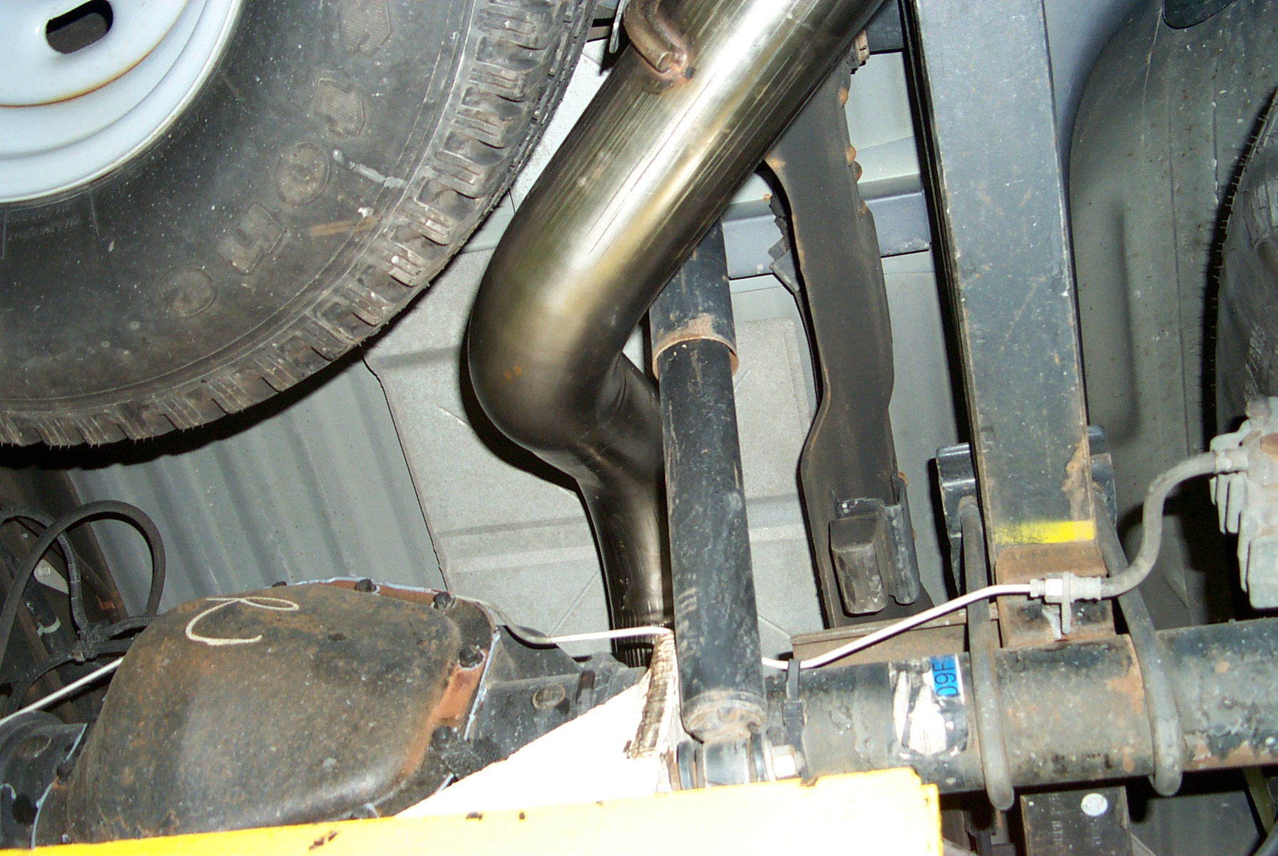 This shows most of the first and longest intermediate pipes (there are three).  The original exhaust had flanges and bolted together above the transmission skid plate.  I cut the original down pipe at the bend so I would not have to remove the transmission support and support the weight of the transmission.  The replacement pipes are designed to be installed without removing the transmission support.